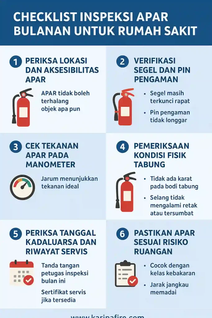 Berikut adalah checklist inspeksi APAR bulanan yang wajib diterapkan rumah sakit sesuai standar internasional dan regulasi nasional.